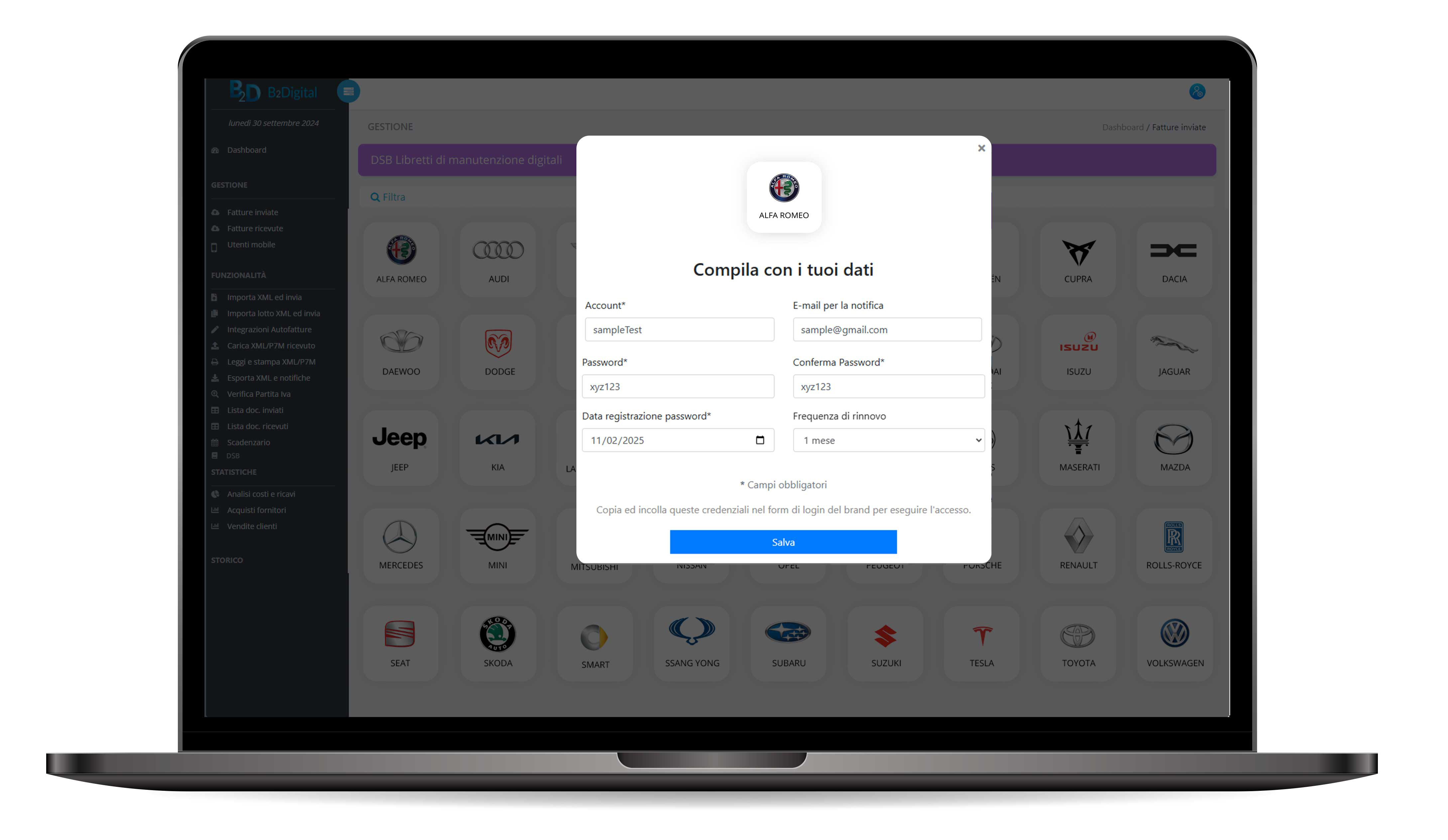 La sezione DSB di B2Digital si arricchisce con la nuova funzionalità Premium progettata per ottimizzare la gestione quotidiana delle officine: memorizzazione sicura di ID e password dei portali ufficiali delle case automobilistiche, promemoria automatici per le scadenze periodiche, gestione centralizzata del rinnovo delle credenziali e la possibilità di ricevere tutte le comunicazioni in modo puntuale tramite un’e-mail dedicata.
